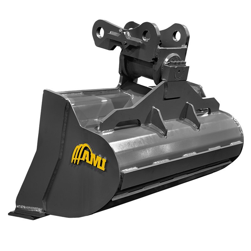 ROTARY TILT DITCH CLEANING BUCKET Achieve greater flexibility with AMI Attachments' Rotary Tilt Ditch Cleaning Bucket. Designed specifically to reach those awkward spots with less repositioning, AMI Rotary Tilt Ditch Cleaning Buckets allow for level grading on uneven terrain, provide a smooth tilting action and are designed with no exposed cylinders or hoses. On 25-75 series excavators, the tilting range is 180-degrees. For excavator series 130-400, the tilt range is 120-degrees.