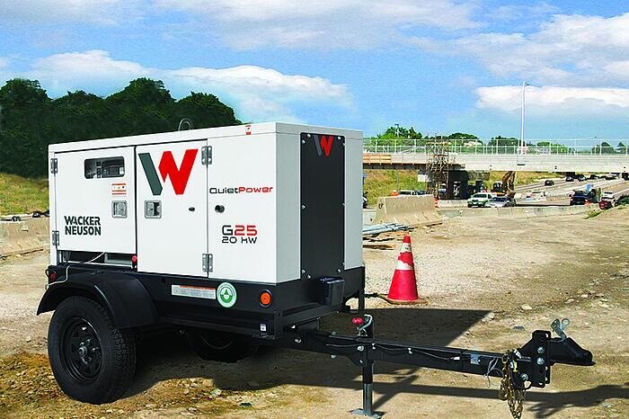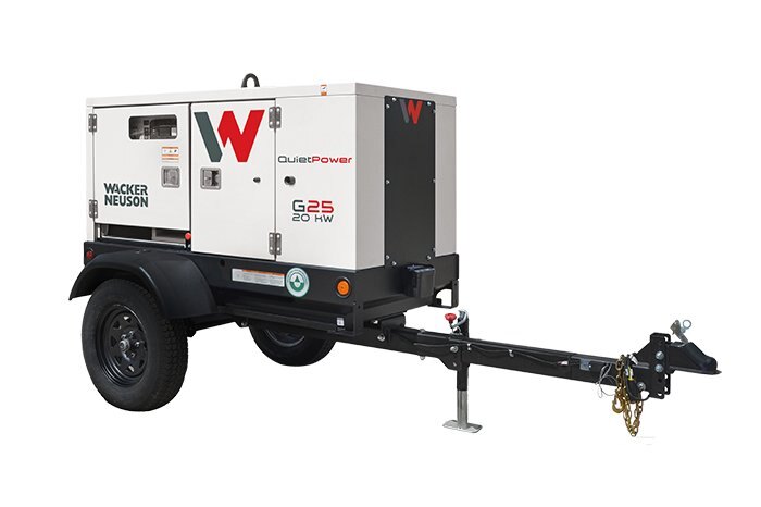 The G25 mobile generator offers contractors and rental houses an excellent power solution. The compact design includes an integrated trailer with folding tongue to allow more machines to fit on a flatbed trailer. The efficient, quiet generator provides single and three-phase power for construction, commercial, industrial and special event applications where quiet, reliable power is needed. A digital controller monitors and protects the generator and engine while providing continuous operating data on an easy to read LCD display. Large capacity fuel tank for long run times and durable features for long life.