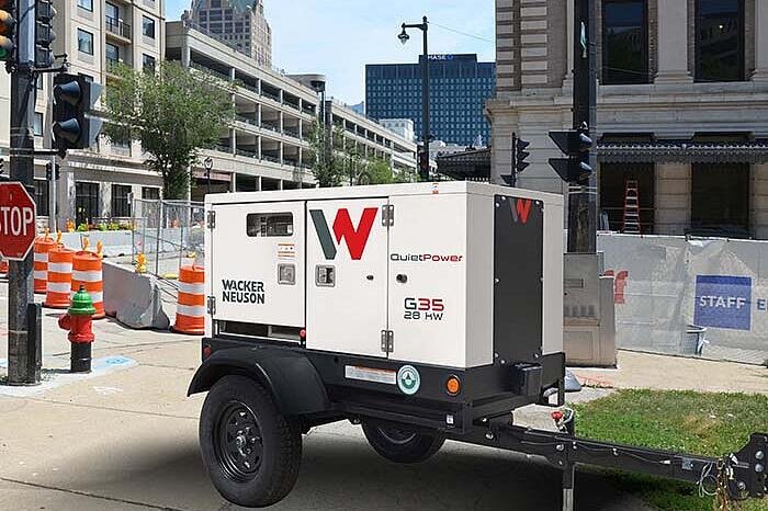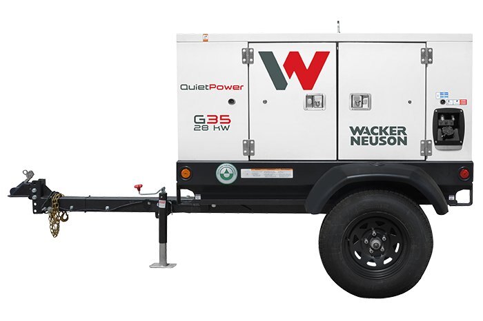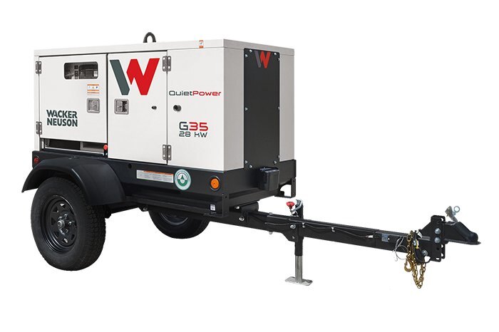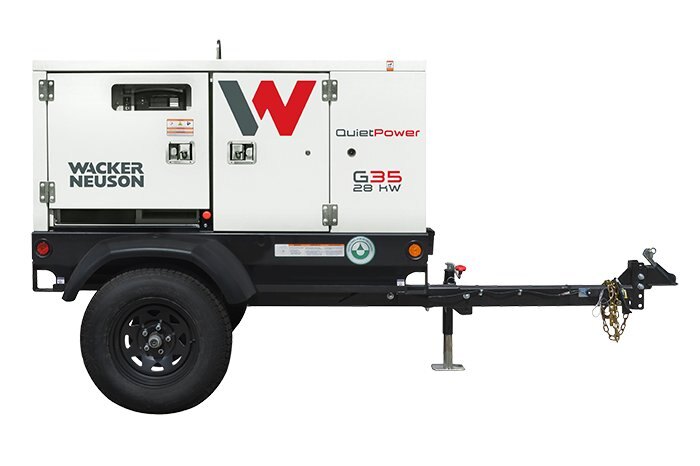 The G35 mobile generator offers contractors and rental houses an excellent power solution. The compact design includes an integrated trailer with folding tongue to allow more machines to fit on a flatbed trailer. The efficient, quiet generator provides single and three-phase power for construction, commercial, industrial and special event applications where quiet, reliable power is needed. A digital controller monitors and protects the generator and engine while providing continuous operating data on an easy to read LCD display. Large capacity fuel tank for long run times and durable features for long life.