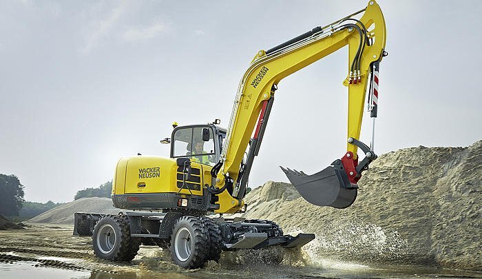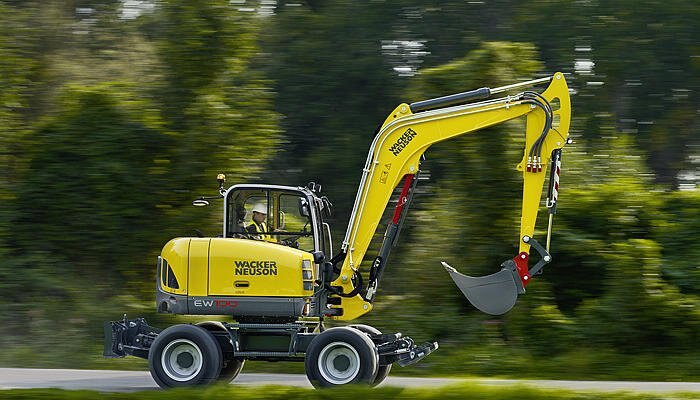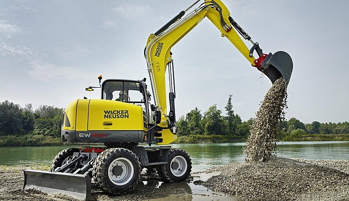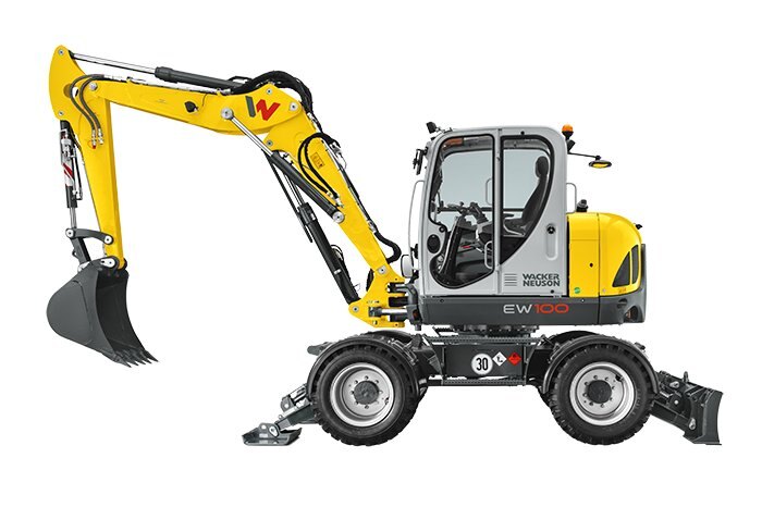 The new EW100 features a more powerful engine, significantly reduced turning radius, increased digging depth and simplified operation. Wheeled excavators save contractors and municipalities money with unparalleled mobility. With its power, reach and mobility, this excavator is the perfect solution for roadside digging and demolition in urban settings. Operators will also appreciate the new easy to use dial control system. Using this automotive-style feature, operators can easily select and save the auxiliary hydraulic flow settings depending on the attachment, eliminating the need for manual adjustments.