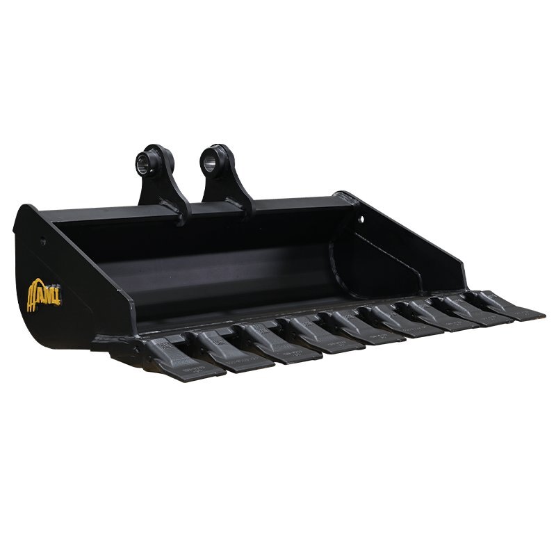 The AMI Grave Style Bucket features a flat bucket and side wall design for creating level bottoms and clean vertical lines for square digging. Wear bars on the underside of the bucket allow for extended digging life.