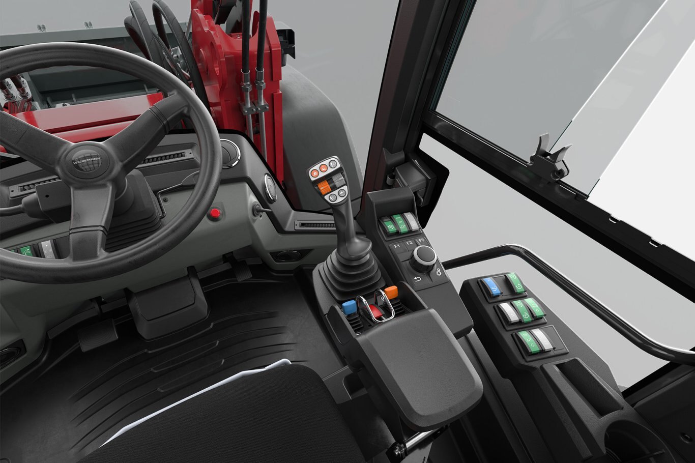 The Lowering Assistant is a semi-automated operator assistance system that automatically telescopes the telescopic boom when lowering. This increases safety when working with the loader, as the load is always guided close to the vehicle, and the machine does not enter the overload range.