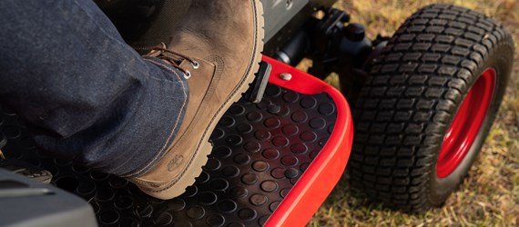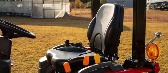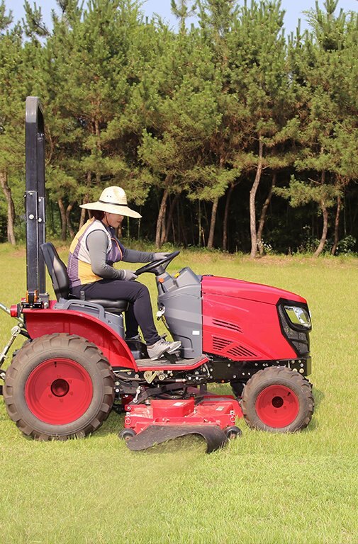 A wide operator cabin with a flat floor offers good visibility and ample leg room, promoting comfortable operation. All controls are within arms’ reach, including a dial to control the cutting height of the mid-mount implement. The accelerator, brake pedal, differential lock and parking brake are easily accessible on the floor of the cabin, located precisely where you expect them to be. These features make this tractor easy to operate, even for novice drivers. |